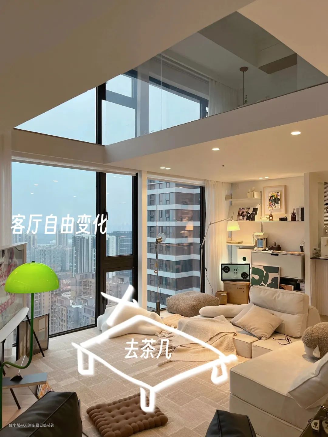去茶几化就是舍弃和弱化刷新茶几在客厅的存在感。让茶几在客厅内不再有笨重的感觉,由此降低它在空间的干扰性,使其在空间内变得宽敞和通透。
