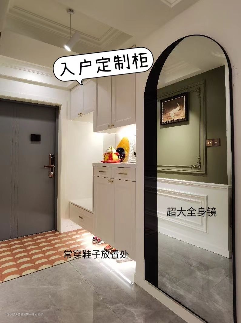 这里的玄关集收纳、归置物品、鞋子放置的功能,特点是有一面超大的全身镜,这是每个女孩子都超爱的设计呀!美美的出门,心晴一整天。