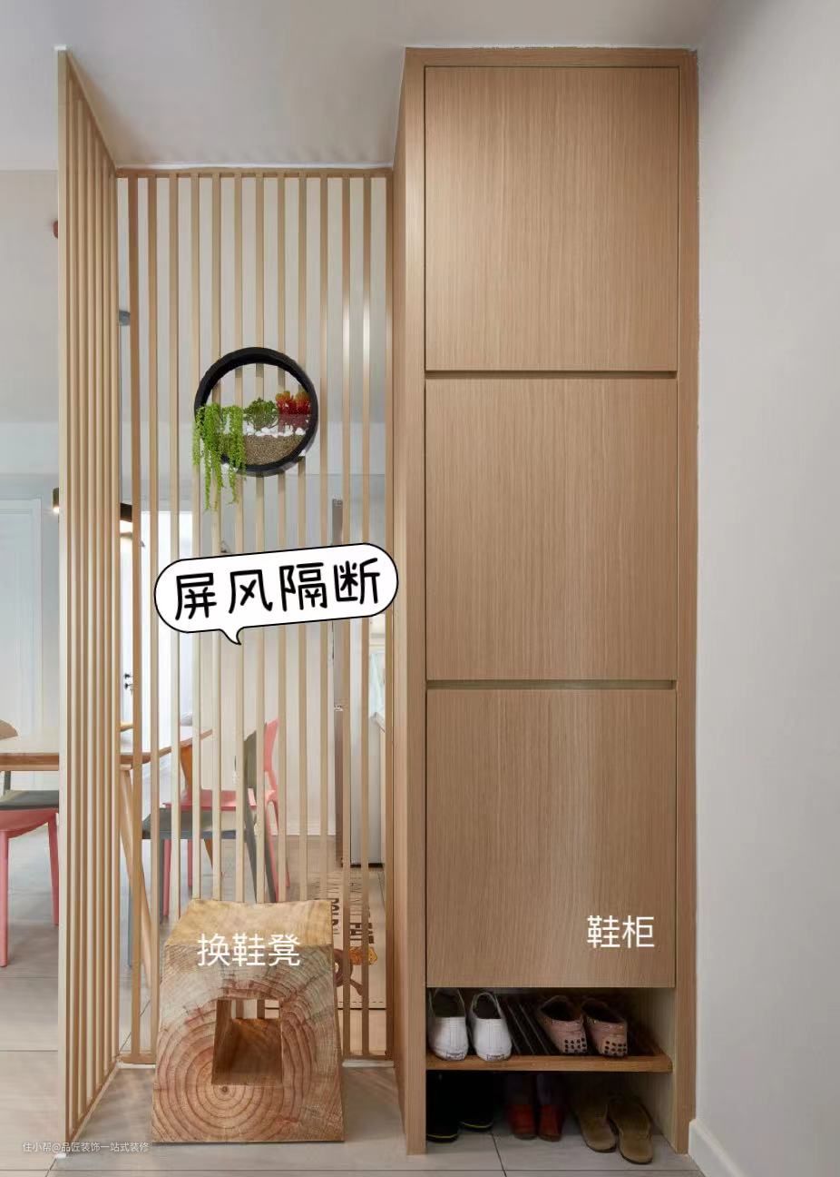 这里的入户玄关和餐厅是连城一体的,采用了竖条镂空屏风来做隔断,这样在入门时即不显得闷感,还能将餐厅和入户处区分功能开是非常不错的选择。右边定制柜是隐形拉手,下方设置上下两层常穿的鞋子,避免常常开柜的麻烦。