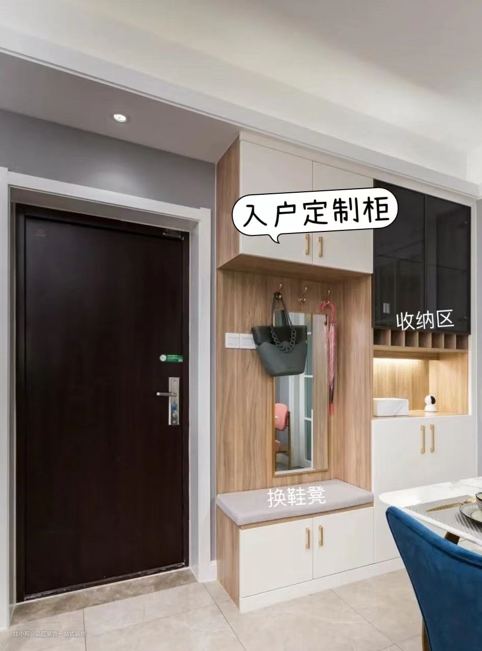和上面功能相类似,这个业主是一位50岁的阿姨,平时出门进门换鞋非常不方便,钥匙和手机也经常忘记带,这次给她设计的悬挂区、还有换鞋凳、全身镜等,定制柜中间留出空间放置钥匙手机等物品,增加了收纳的空间也为日常活动带来了方便。