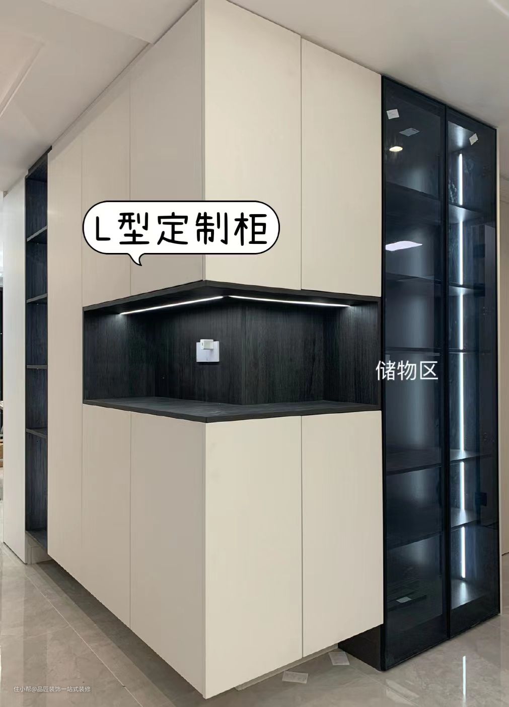 因户型关系,这里设计的是L型玄关定制柜,柜子下面是一排30cm镂空设计,日常的拖鞋、外出鞋都可以归位到这里,一点也不显得杂乱!旁边是一整面的储物区,摆上收藏品这里就是一个展览区,非常奈斯哦~