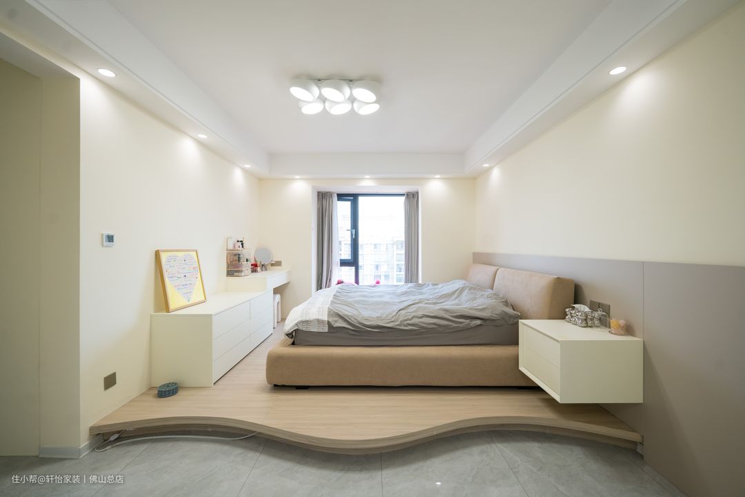 卧室整体延续现代简约风格,回形吊顶与筒灯的布置让整个空间宽敞明亮,窗户让白也足的自然采光环境,沐浴在光线下的居住环境必定能够保持心情舒畅呀~~波浪形原木低阶安装在整个休息确分区的同人一种舒适蜗居的感觉。