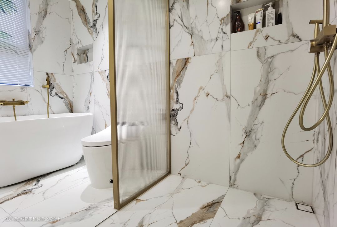 6.如果卫生间比较小,我们甚至可以选择做成无障碍淋浴间,不仅去掉挡水条,连下沉都不用做,直接将地砖通铺整个卫生间,让地面形成一个整体,实现无障碍通行,安全性更高,也更方便清洁。这种就可以将玻璃隔断做宽一些,遮挡效果好一些。