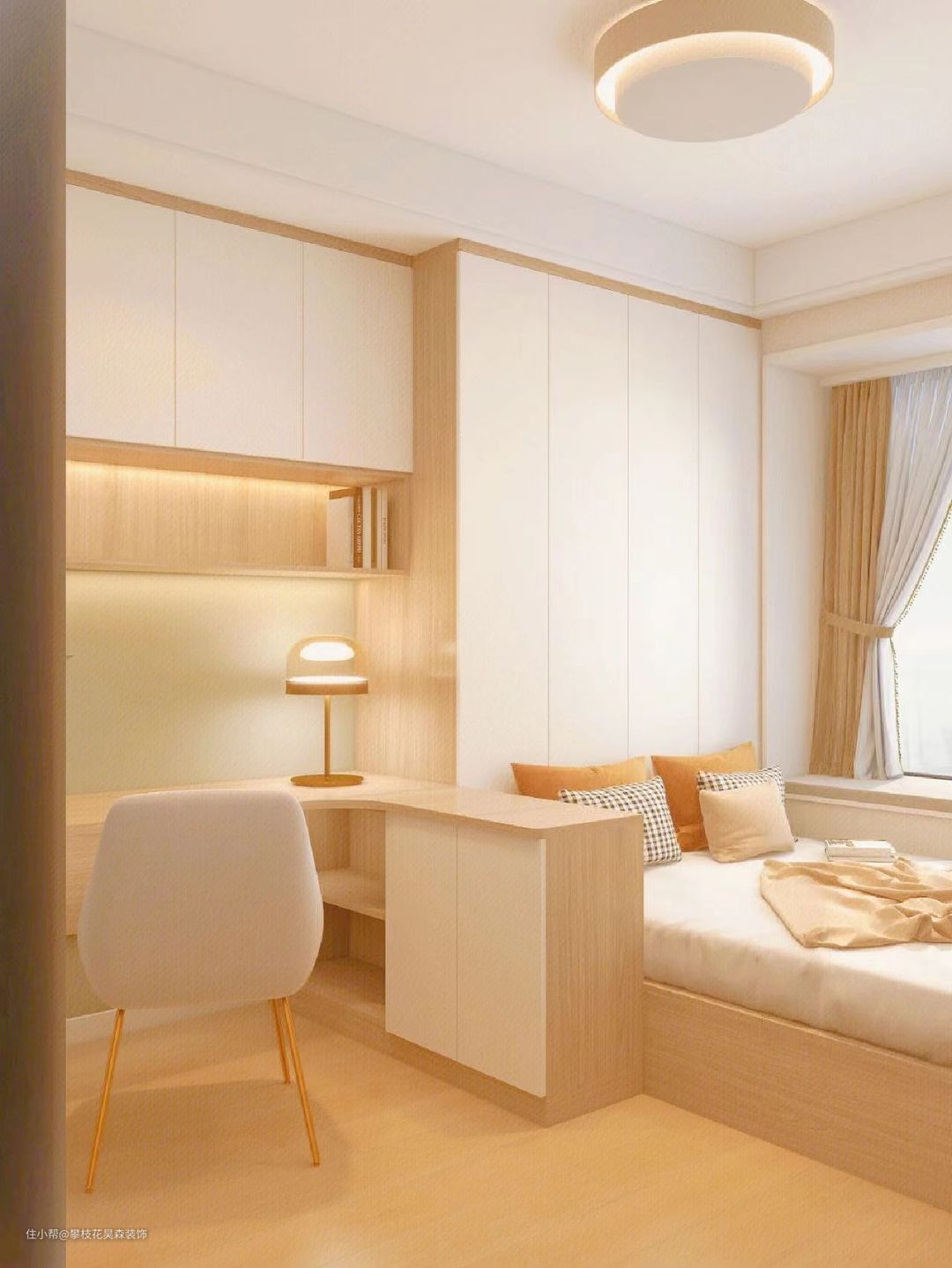 Ⅴ:原木风榻榻米设计,衣柜采用两色,柜体采用原木色,门板采用白色,增强整体原木质感,白色百搭,衣柜做一门到顶,免拉手设计,高级感满满,免拉手设计有一个比较使用的好处,可以防止撞头,做L型转角书桌,方便日常的办公需求,风格搭配,舒适,温馨,放松。
