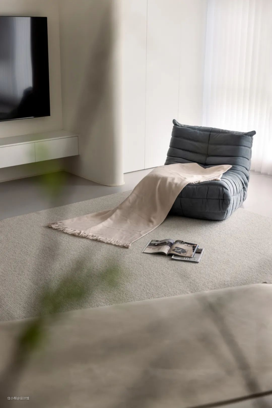 ▲电视墙左侧是木饰面+隐形门的设计,中间悬空安装电视柜+电视机,右侧靠窗装一个收纳柜,并且做了一个圆弧形的造型,布置上灰色休息沙发椅,为主人营造了一个惬意从容的休闲区域。