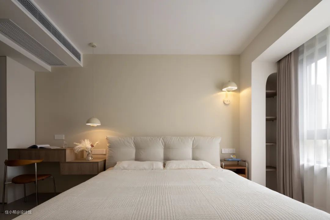 ▲卧室床头墙是奶油色的乳胶漆,左侧布置书桌+床头柜+吊顶组合,右侧布置床头柜+壁灯,布置一张米咖色床铺+朴素的床单,让卧室显得简洁而又文雅自然。