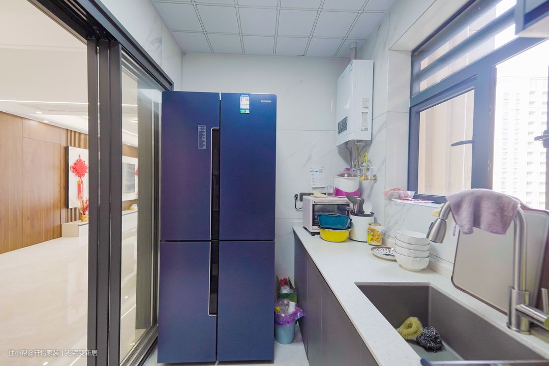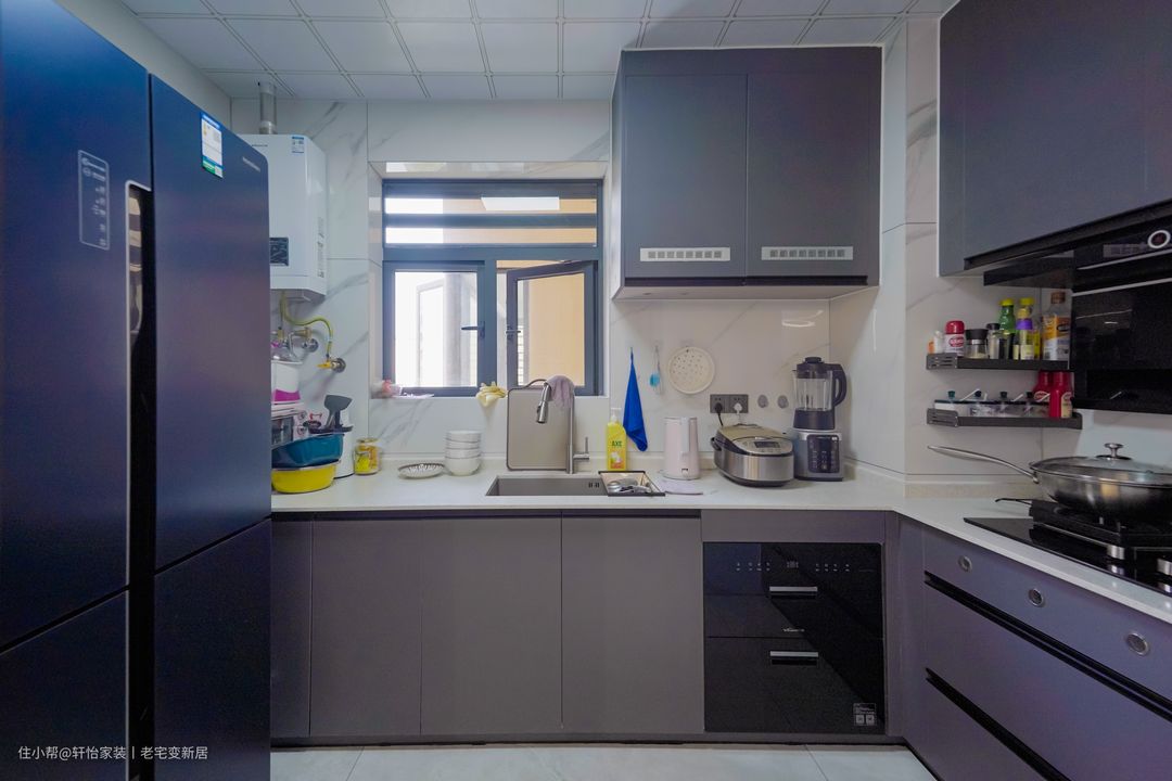 L型的厨房布置很适合空间狭小的厨房定制,能够扩大厨房的使用空间,增加动线的流畅度区共同使用的目的柜都统一采用蓝灰色,大气简洁。洗碗台上方开了一扇小窗户,能够增加厨房内的采光。