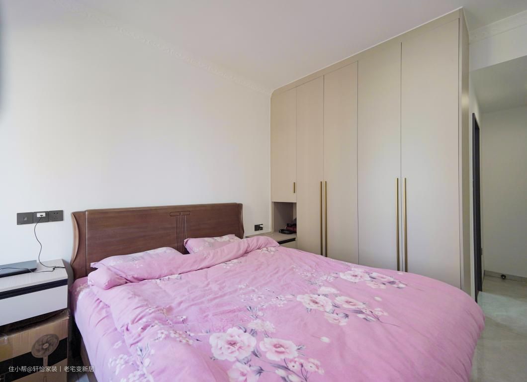 主卧整体非常简约,床体仍然是中式家具,延续了双厅风格。顶天立地的衣柜定制能够容纳多件衣物,高柜也很适合悬挂长裙等衣物,顶面做起到防尘作用,避免清洗烦恼。