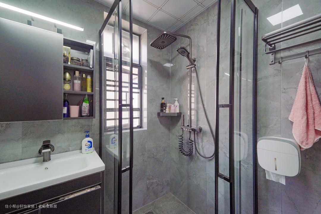 卫生间面积不大,T字型格局可以扩大空间利用效率,用半弧形玻璃隔断门隔开浴室区域,在起到节省空间的同时湿分离的干处不沾水,另外玻璃隔断有助于增加采光,让淋浴区的光线穿透玻璃,给予整个空间充足采光。