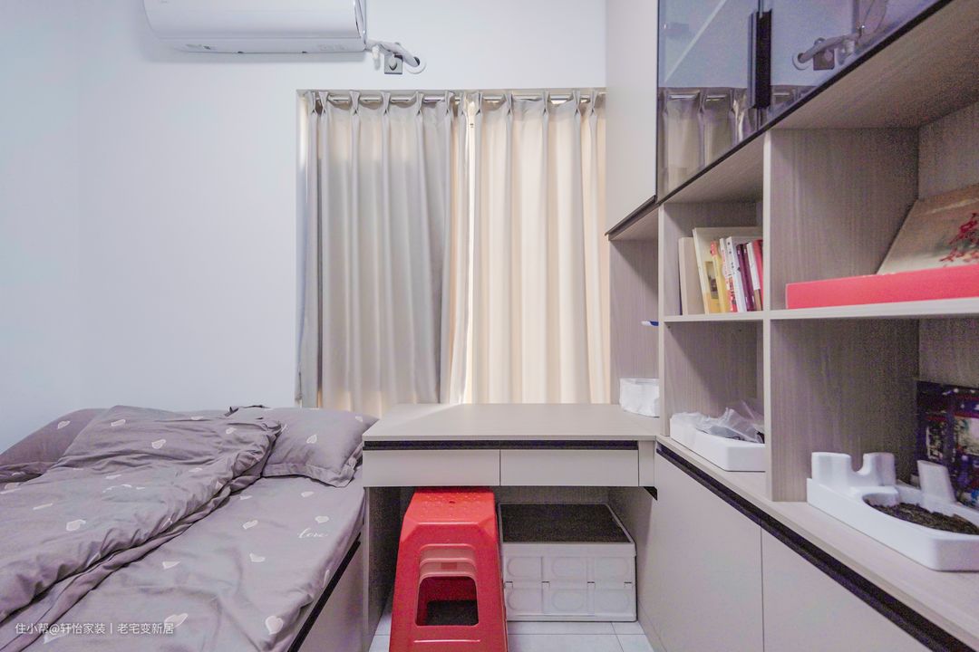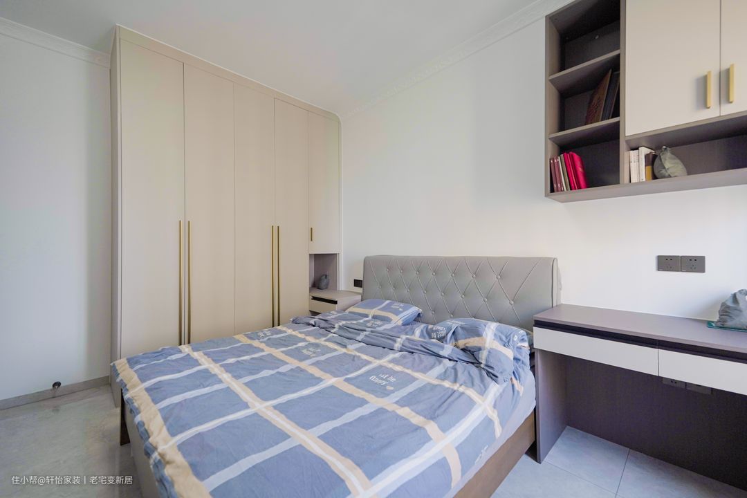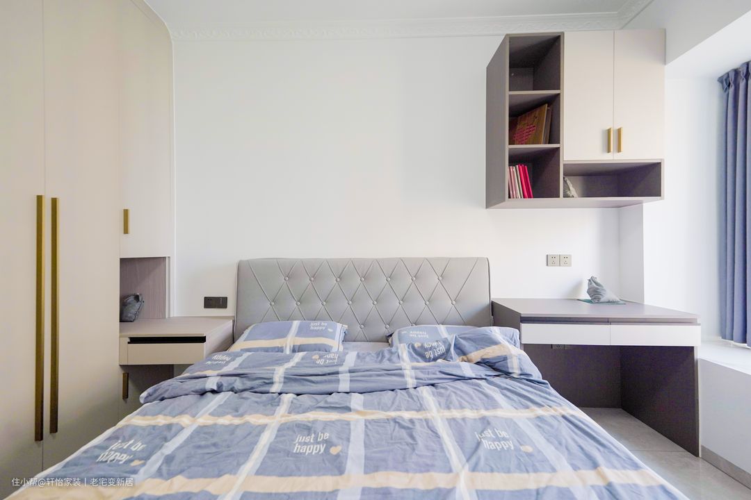 次卧风格跟客卧保持一致,在设计上又与主卧如出一辙,其设计点相似在利用柜体延伸区域用作床头柜使用。右侧根据空间面积嵌入摆放了一张小台桌,桌顶吊柜与到顶衣柜风格一致,两者交相呼应。