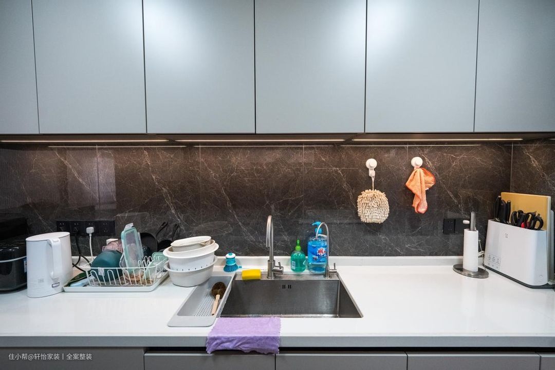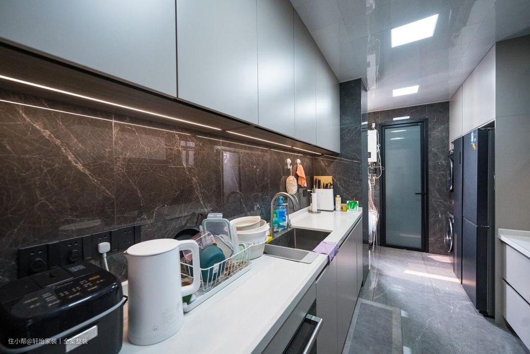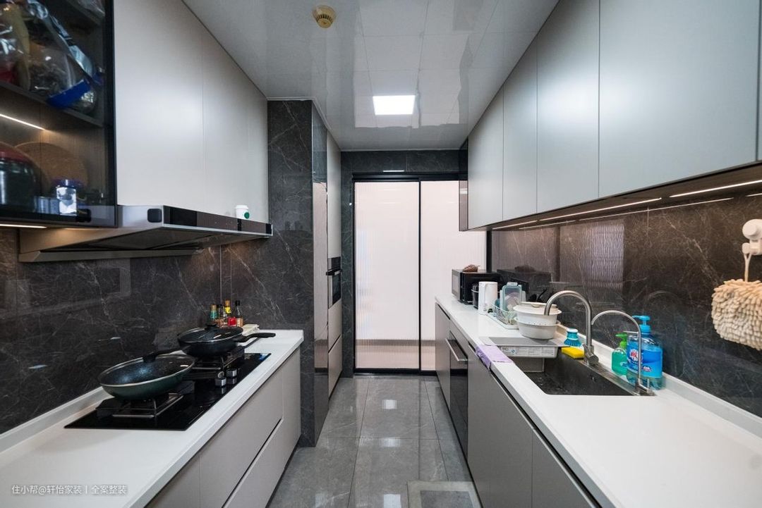 厨房用玻璃门进行隔断,延长空间视线,让小厨房不显得逼彻和局促。进入厨房,能感受到深浅不一的灰与白的过渡配色,让厨房看上起非常高级大方。