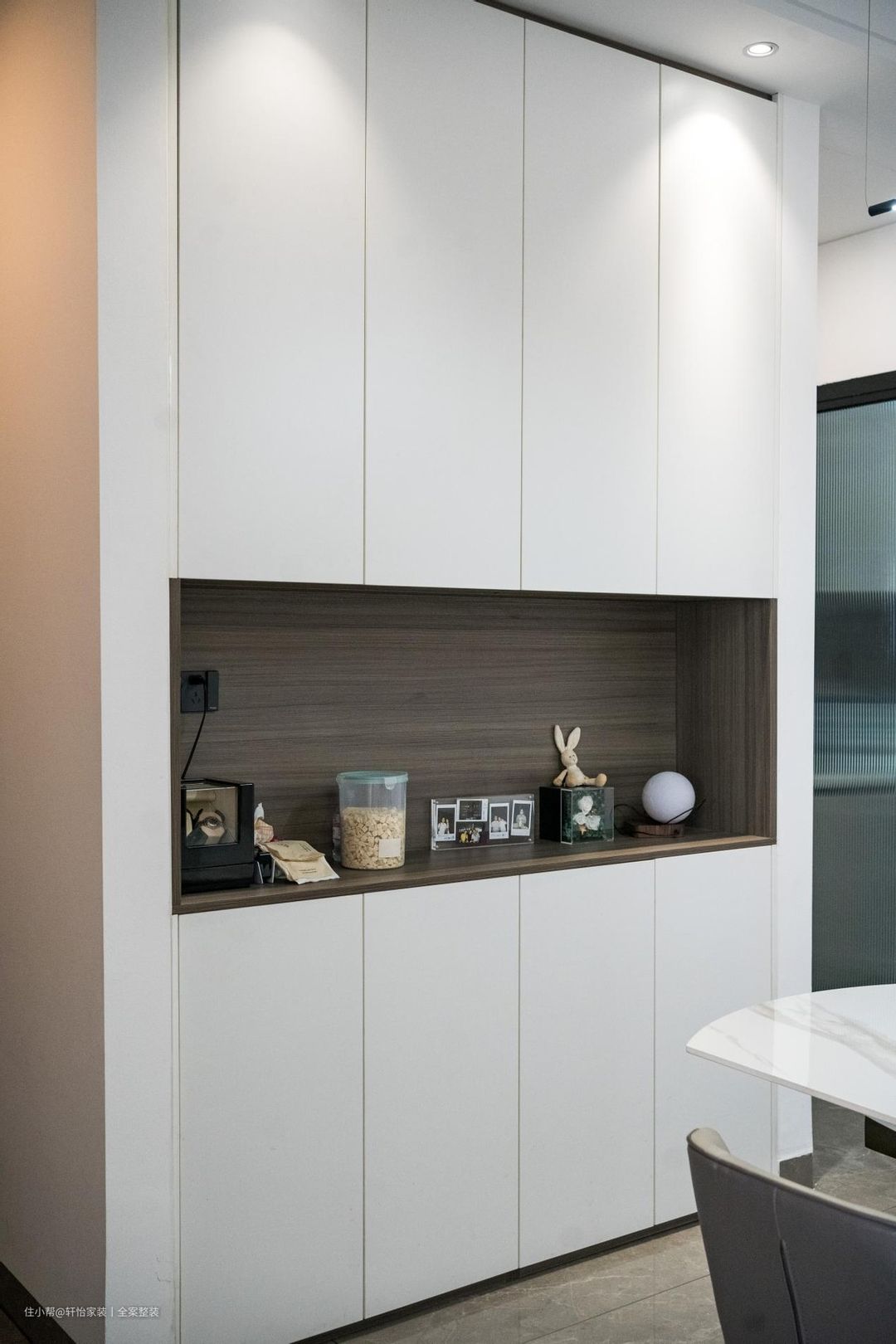 餐边柜搭配与玄关柜搭配大同小异,同在相同的配色与柜体款式,异在餐边柜是大面积的白搭配镂空凹处的木色,在配色格局上与玄关柜的截然相反。