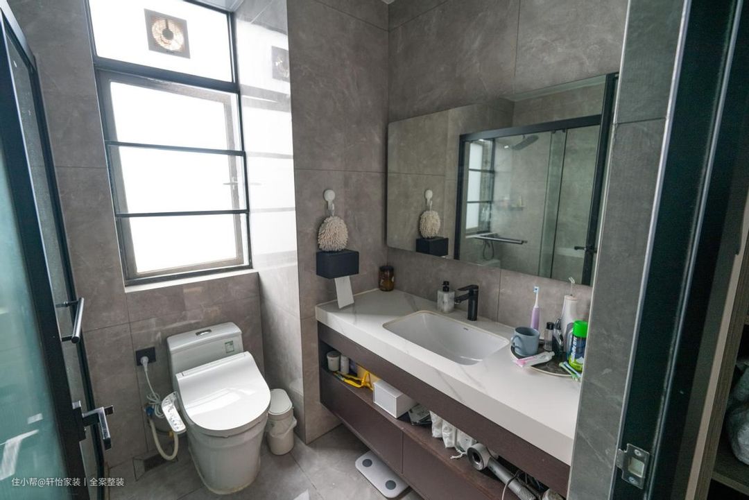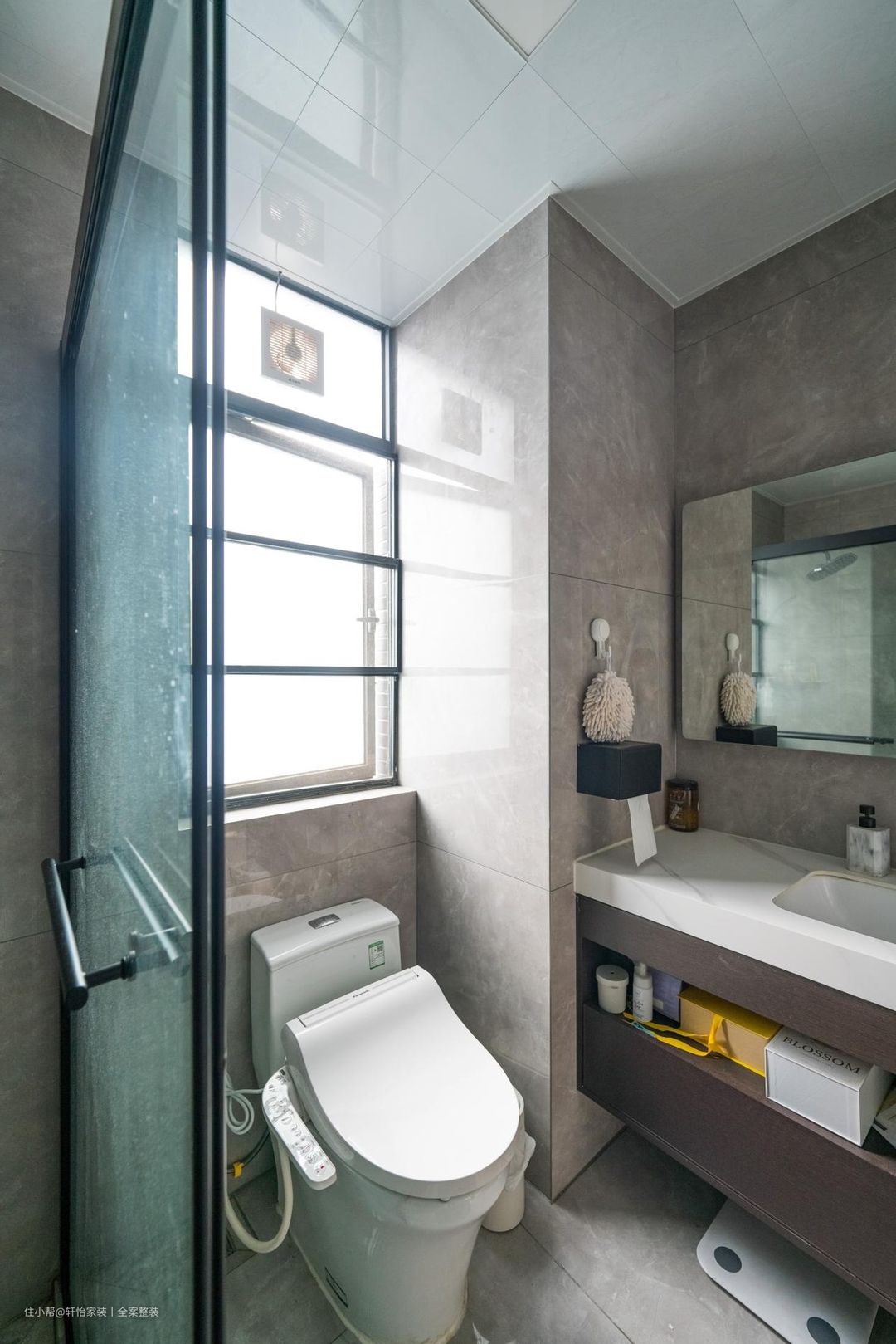 卫生间淋浴区、马桶和洗手台之间呈L型布置,扩增收纳量的同时,也让视觉往公共区域延展,有助空间扩容。浴室有推拉式玻璃门隔开了外部区域,防止水溅外部,而且外形美观,很有高级感。