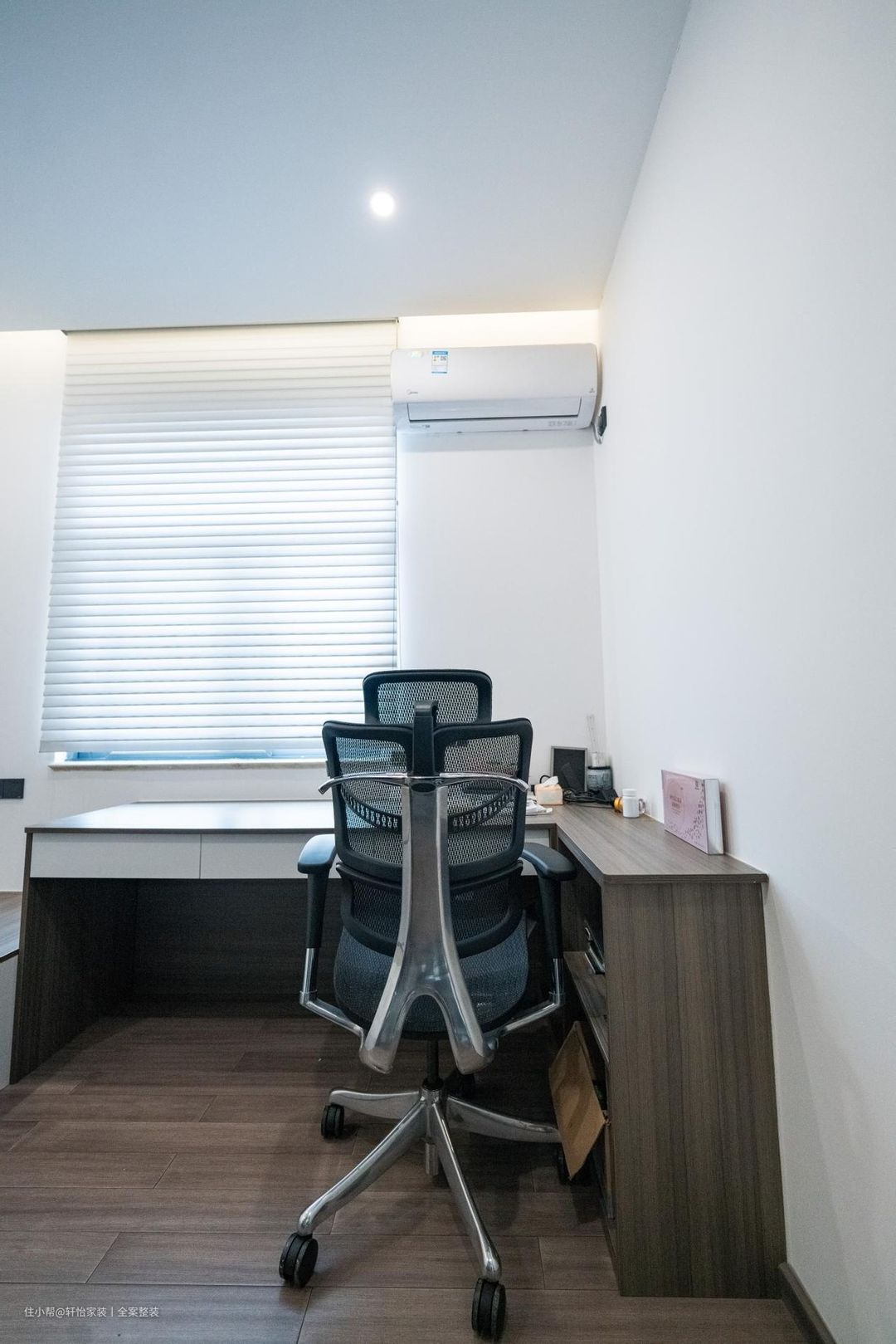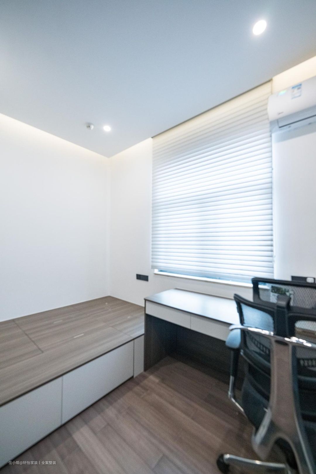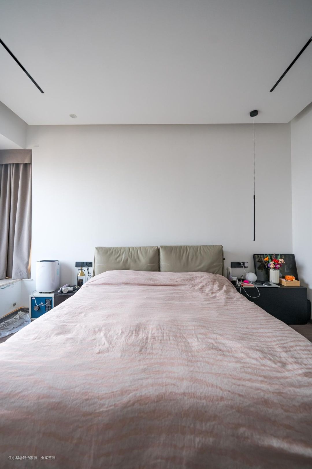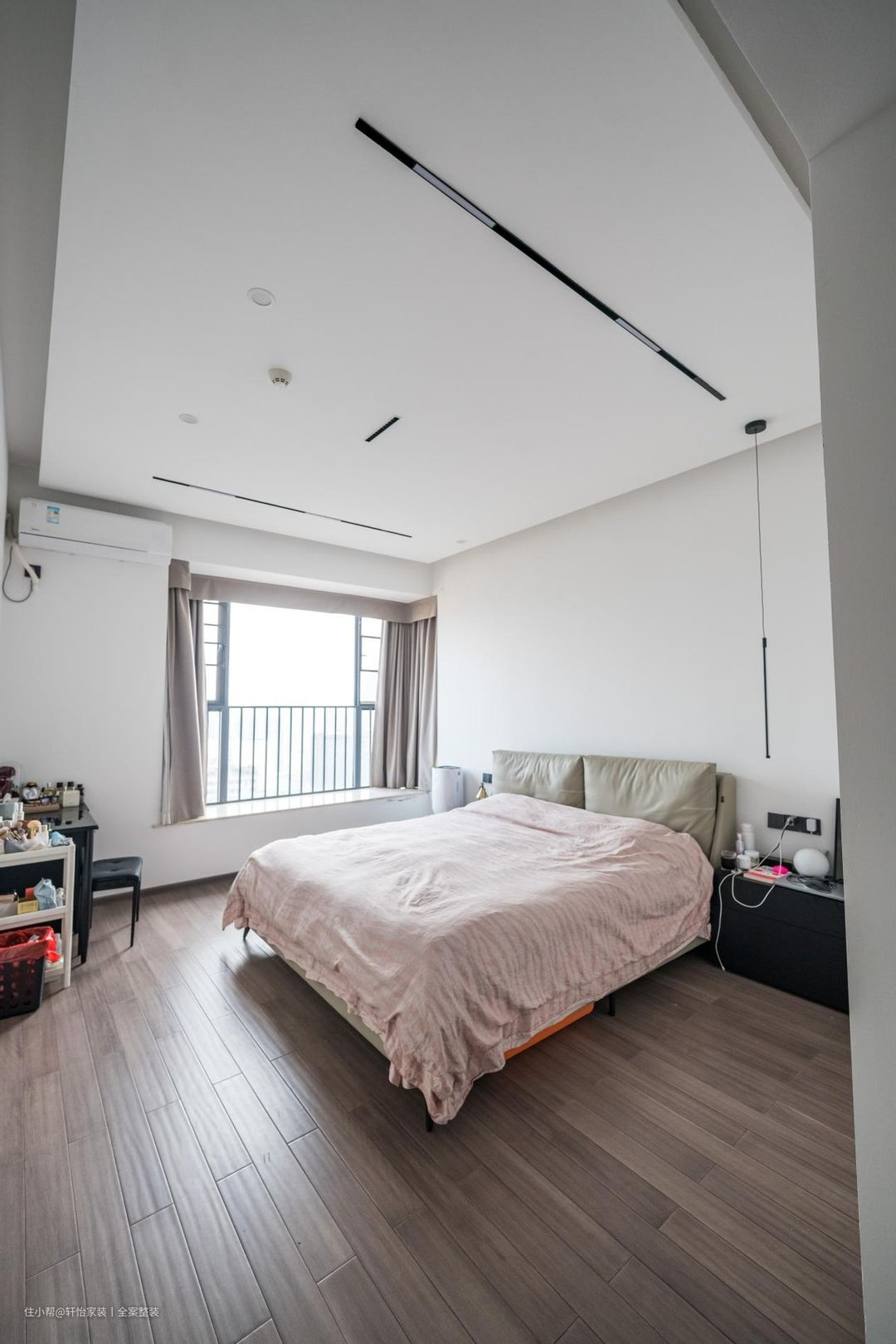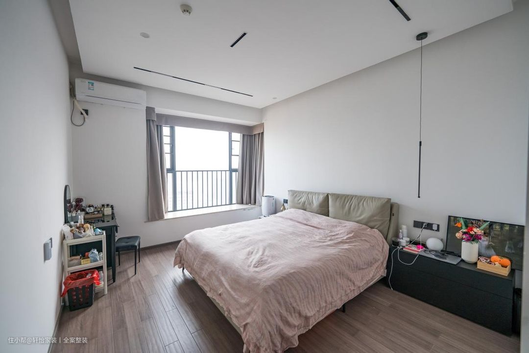 在风格上是承接了全屋的色系格调,铺上胡桃木色地板,成为卧室的主色彩。通刷的白色墙面搭配悬浮型大平顶与线灯布置视觉上延展了层高,辅之以半墙落地窗户,让整个空间更加通透。