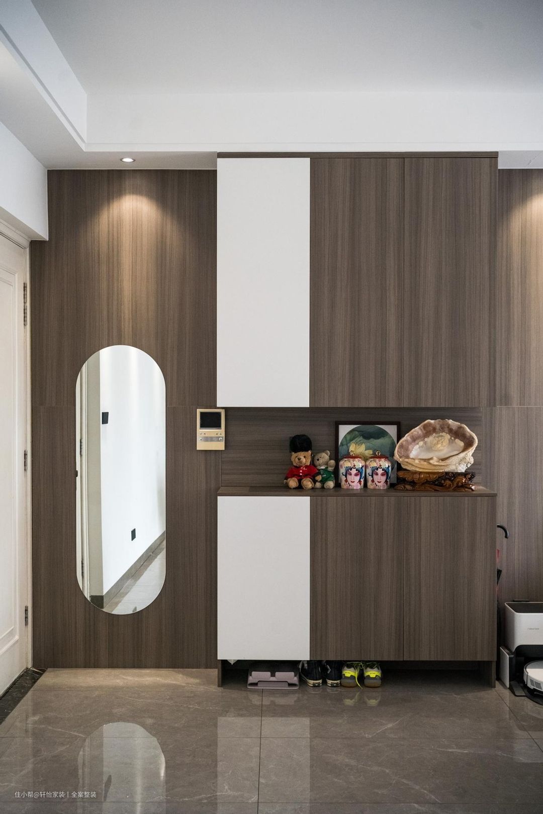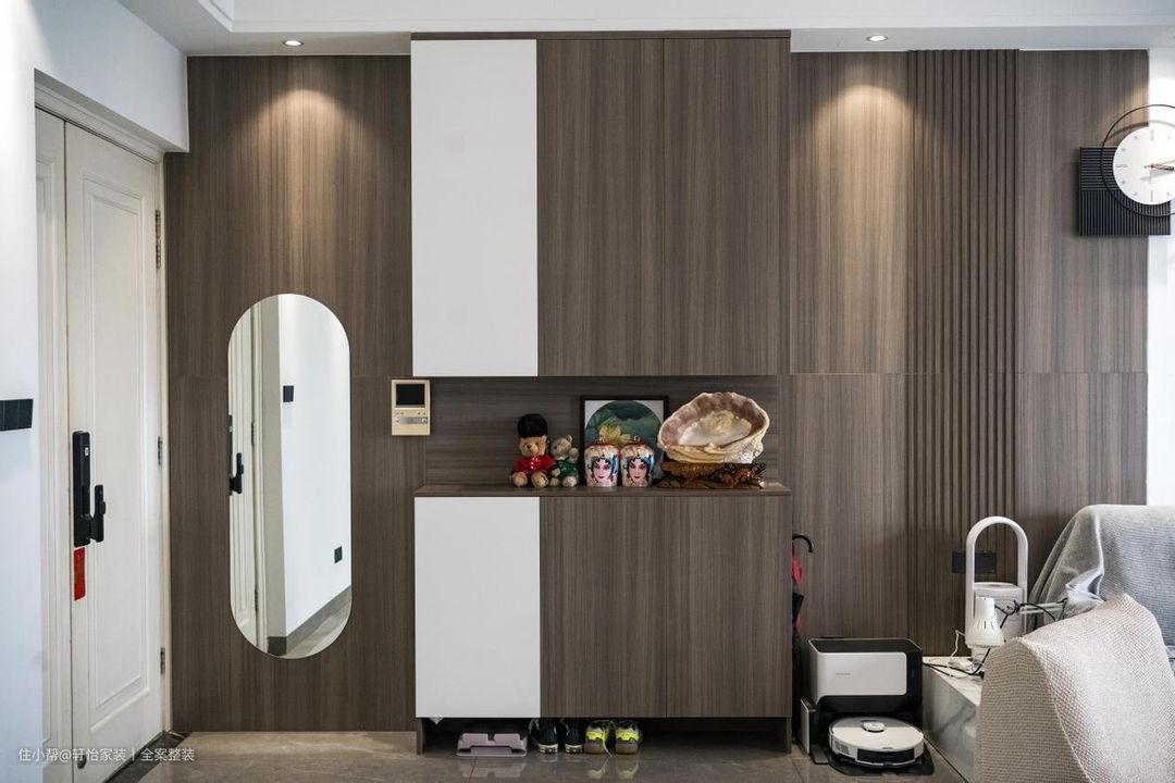 柜体与大门之间搭配的穿衣镜,点缀其中,起到装饰美化作用,当然还便于主人翁出行使整理妆发和衣物作用,可谓一举双得。