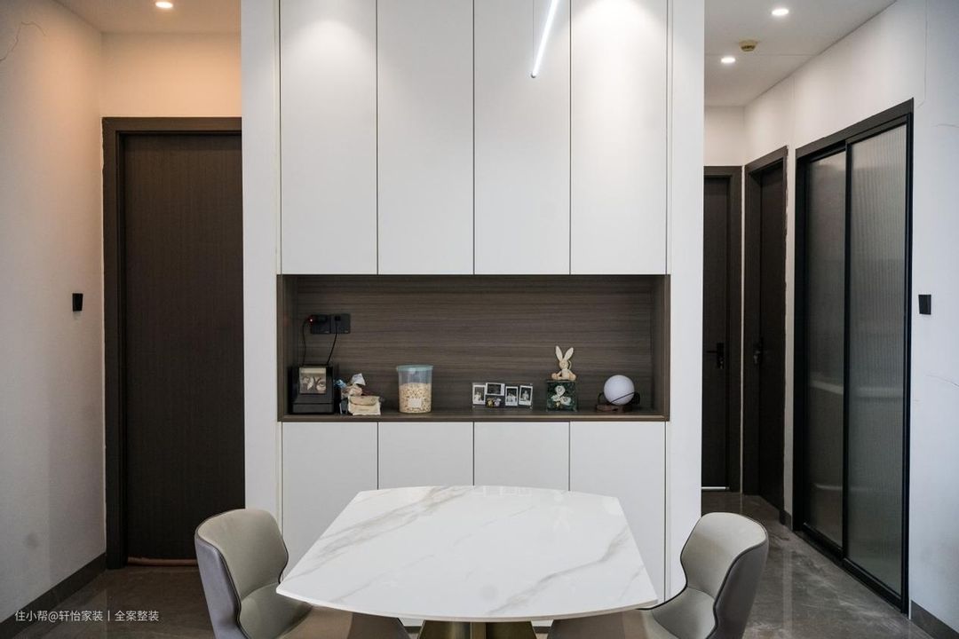 餐厅空间不大不小,刚刚好,位于双侧过道中间,起到两侧隔断效果。白色大理石餐桌简洁大方,与白色餐边柜搭配,在视觉上让餐厅显得更大起来。