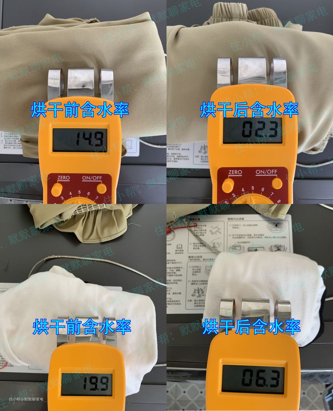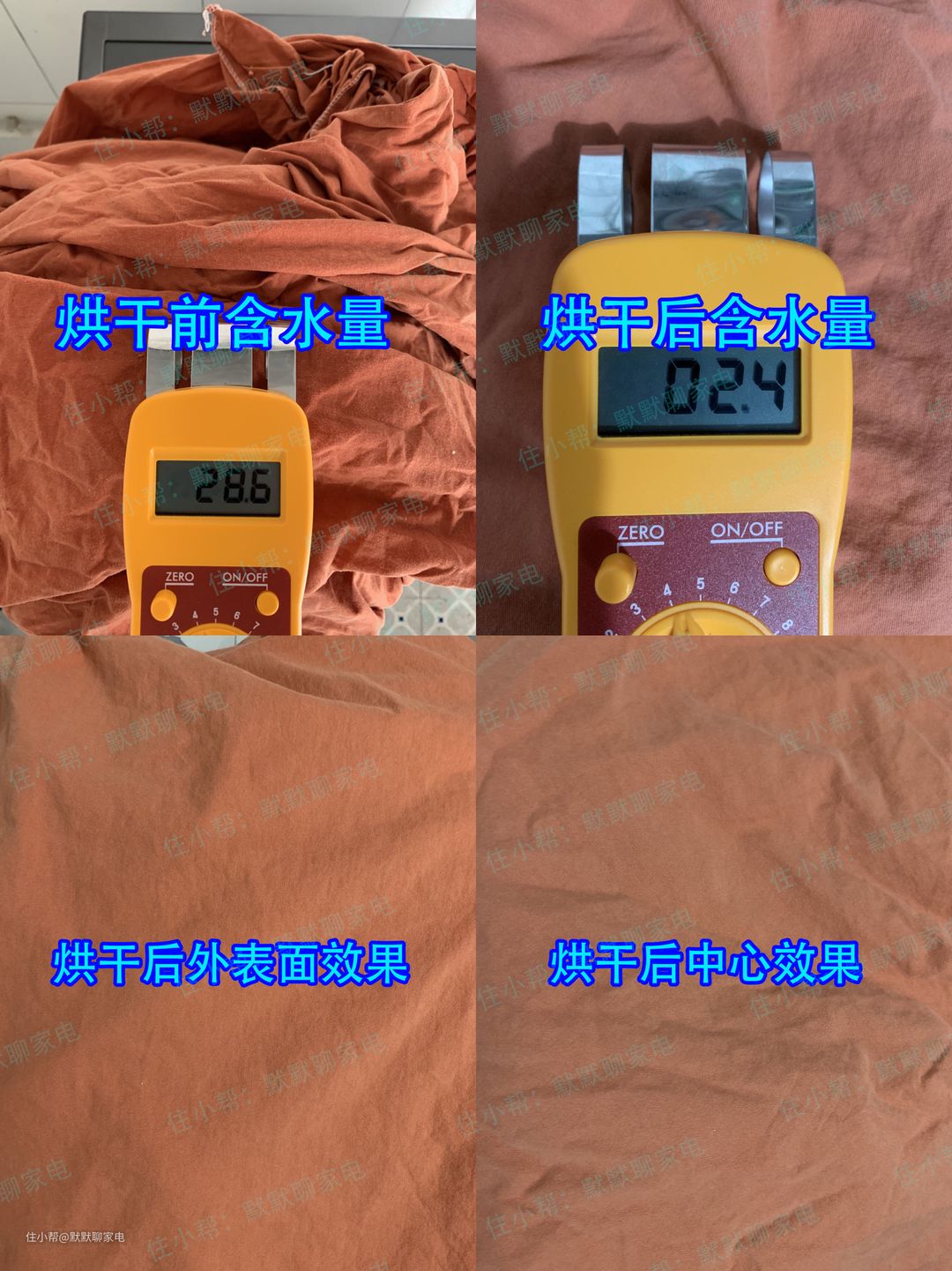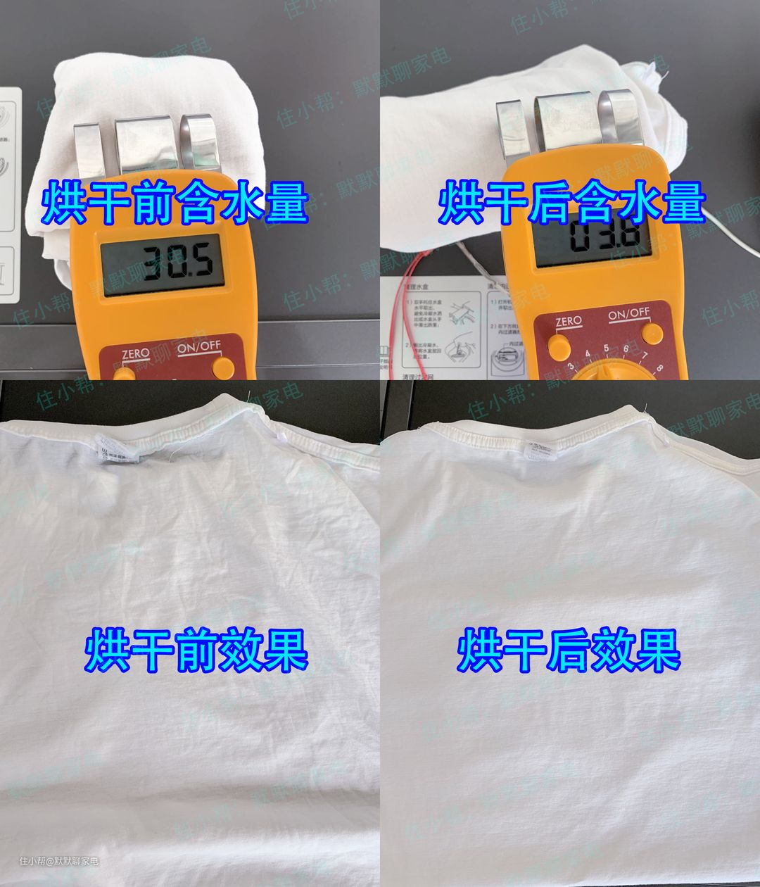 这个是棉T恤的烘干效果,烘干前含水率是30.5,烘干后的含水率是3.8,直接上身穿是完全没问题的,干爽舒适。这里解释一下为什么要卷起来测湿度,因为水分仪测量深度是50mm,衣服叠加厚度需要达到50mm。