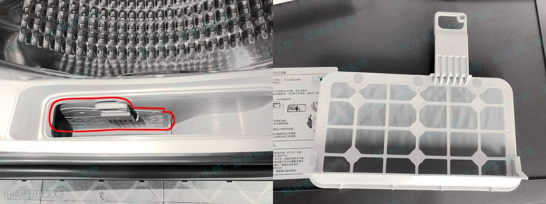 其次是线屑收集器在滚筒口处的下方,在轻薄衣服快干时,有时会被吸附到这个地方,然后就不会在滚筒里翻滚了,不过这个影响也不大,只是一个小小的问题,整个行业也都是这么设计的,如果设计在别的地方,风道就会拐弯次数多,影响空气流通,进而影响烘干效果,也会增大噪音。