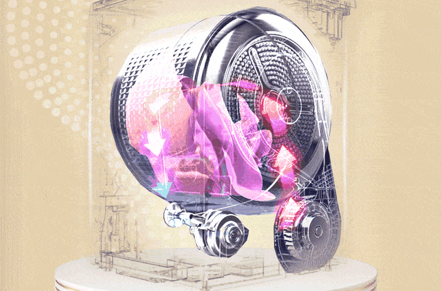 这个是滚筒内壁细节,面包柔护内筒,突出立方体圆润饱满,运转过程中不伤衣服,在内筒长时间热风吹的情况下,内筒金属材质也会变热,突出立方体可以像熨斗一样抚平衣服表面褶皱,除皱跟这个设计细节有直接关系。