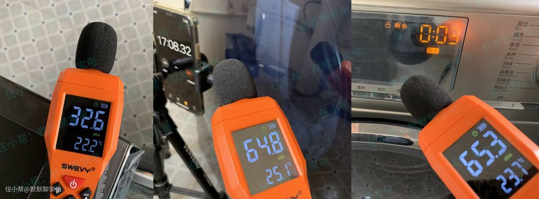 上图最右边我测的是海尔直驱滚筒洗衣的脱水噪音,设置脱水转速是1200转,噪音大概是65分贝,它俩的噪音值差不多,如果家里有海尔直驱滚筒洗衣机的,可以把脱水转速设置到1200转实际体验一下。
