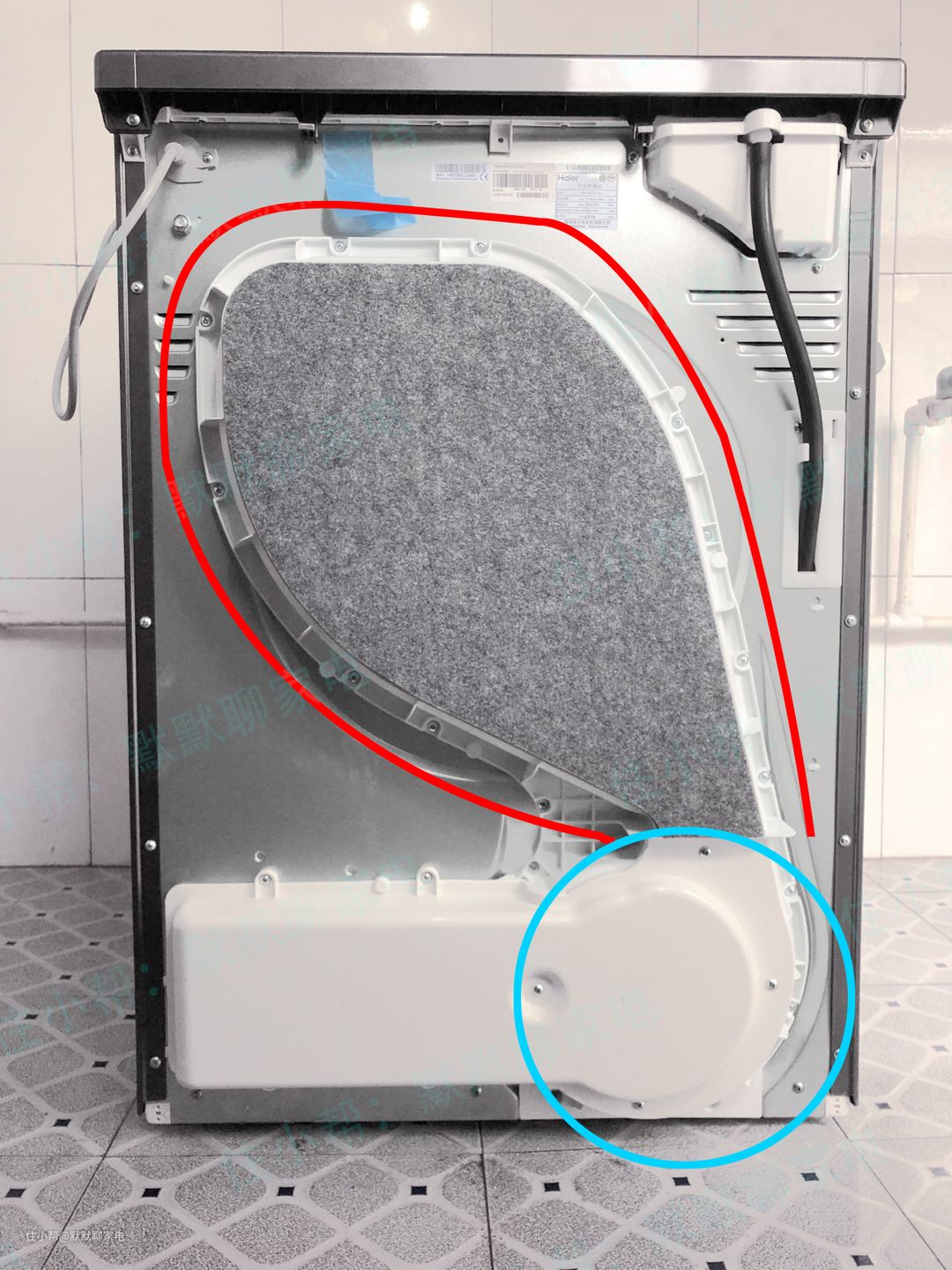 后面蓝色圆圈的部位就是单独的吹风机,“双擎”指的就是两个电机,这是其中一个电机,专门往滚筒内送风,另一个电机在烘干机内部,是驱动滚筒转动用的。