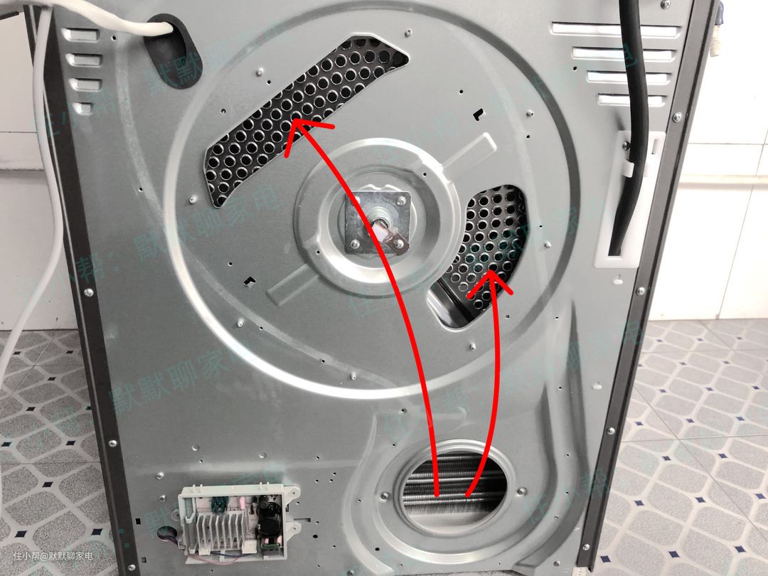 拆掉Hybrid电辅热模块后看到的就是这个样子,热风从下边出来,分别从上边两个进风口进入滚筒内,两个进风口刚好分布在相对立的位置,可以使滚筒内的温度更均匀。