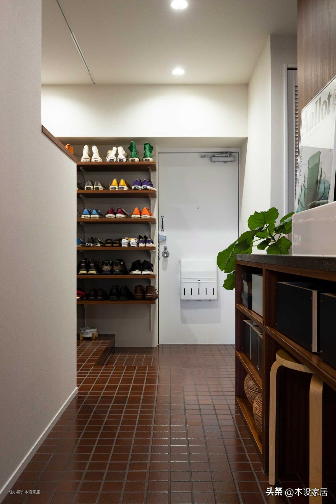 玄关的左边是开放式的层板鞋架,收纳着一家三口各种颜色和款式的常穿鞋,一字排开,像鞋店里一样整齐,令人叹为观止。
