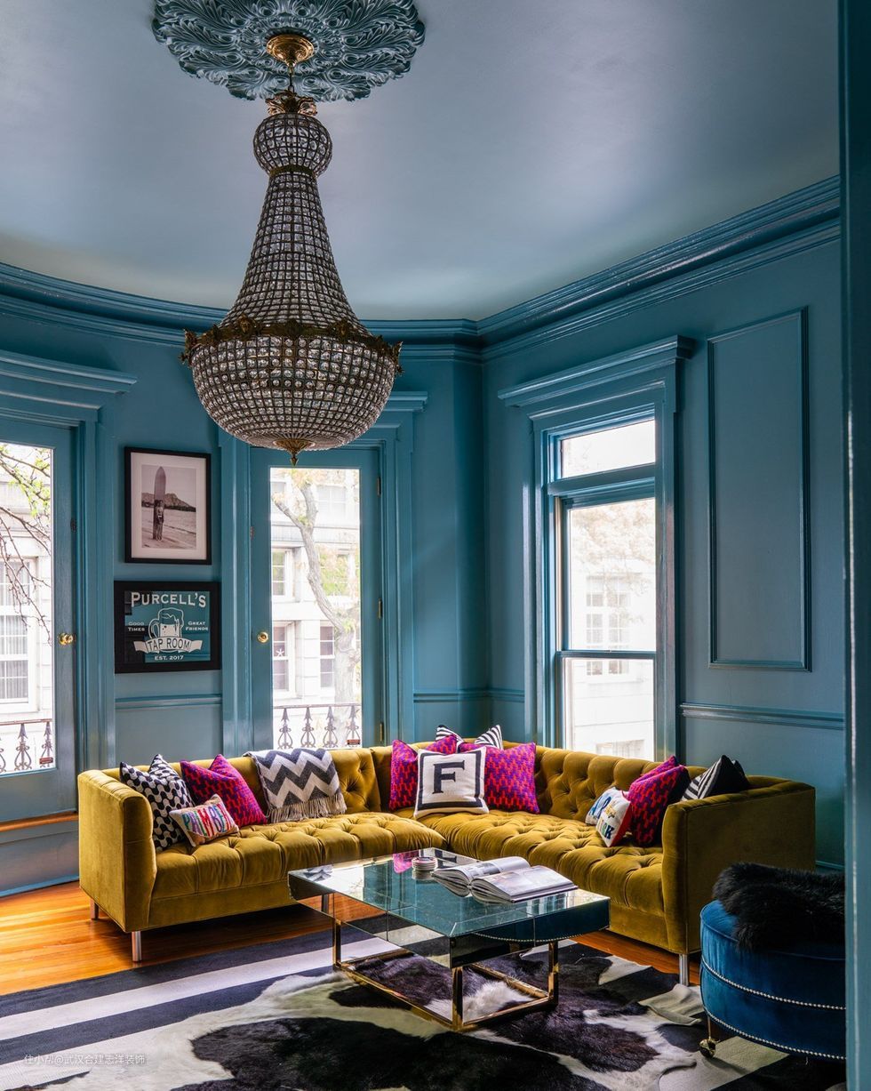 多巴胺装饰的一个很好的起点。当用于整个房间时,它是一个大胆的选择,但足够柔和,不会过于压倒。我们也喜欢这里愉快的黄色点缀。