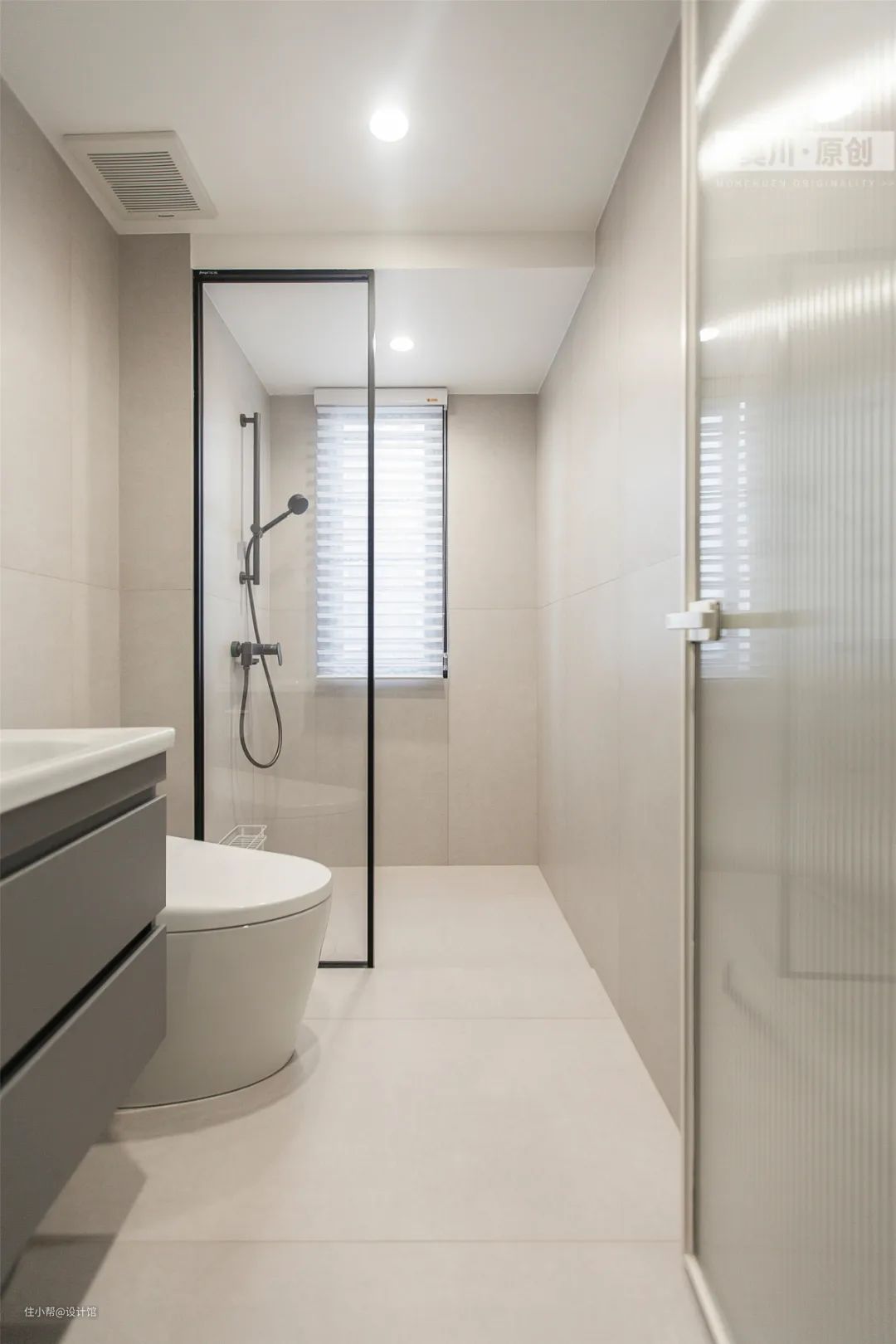 ▲主卫空间以洗手盆、马桶、淋浴房的一字型布局,让长条形的卫浴空间得以合理布局。