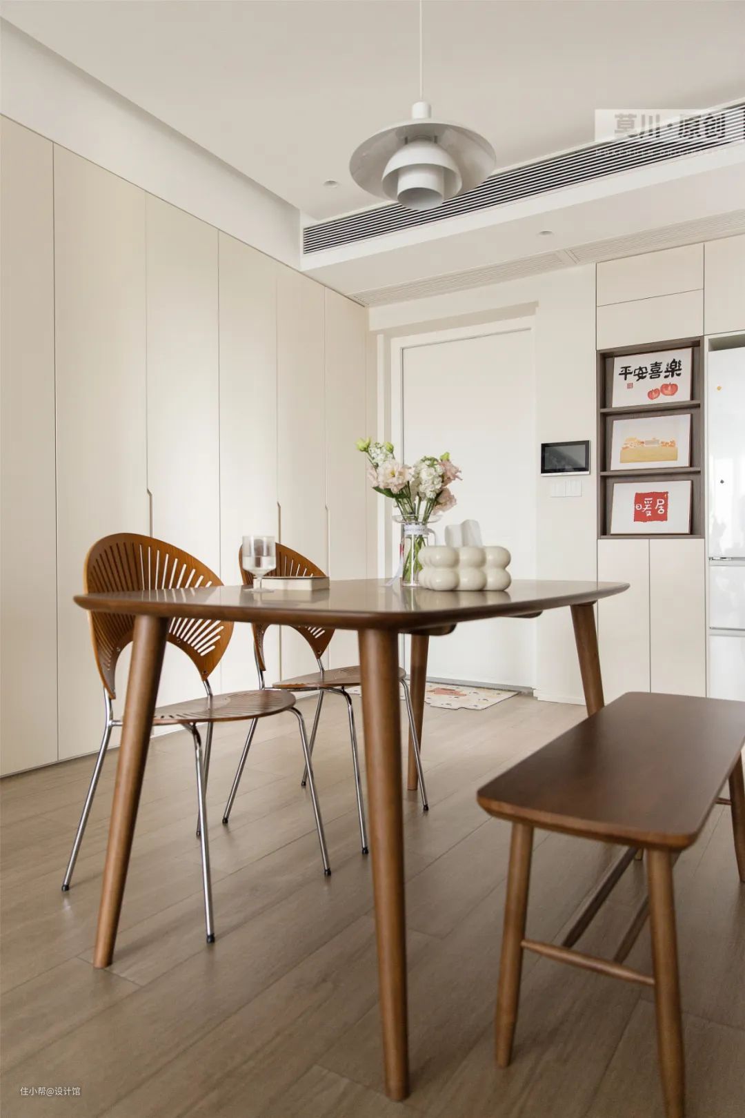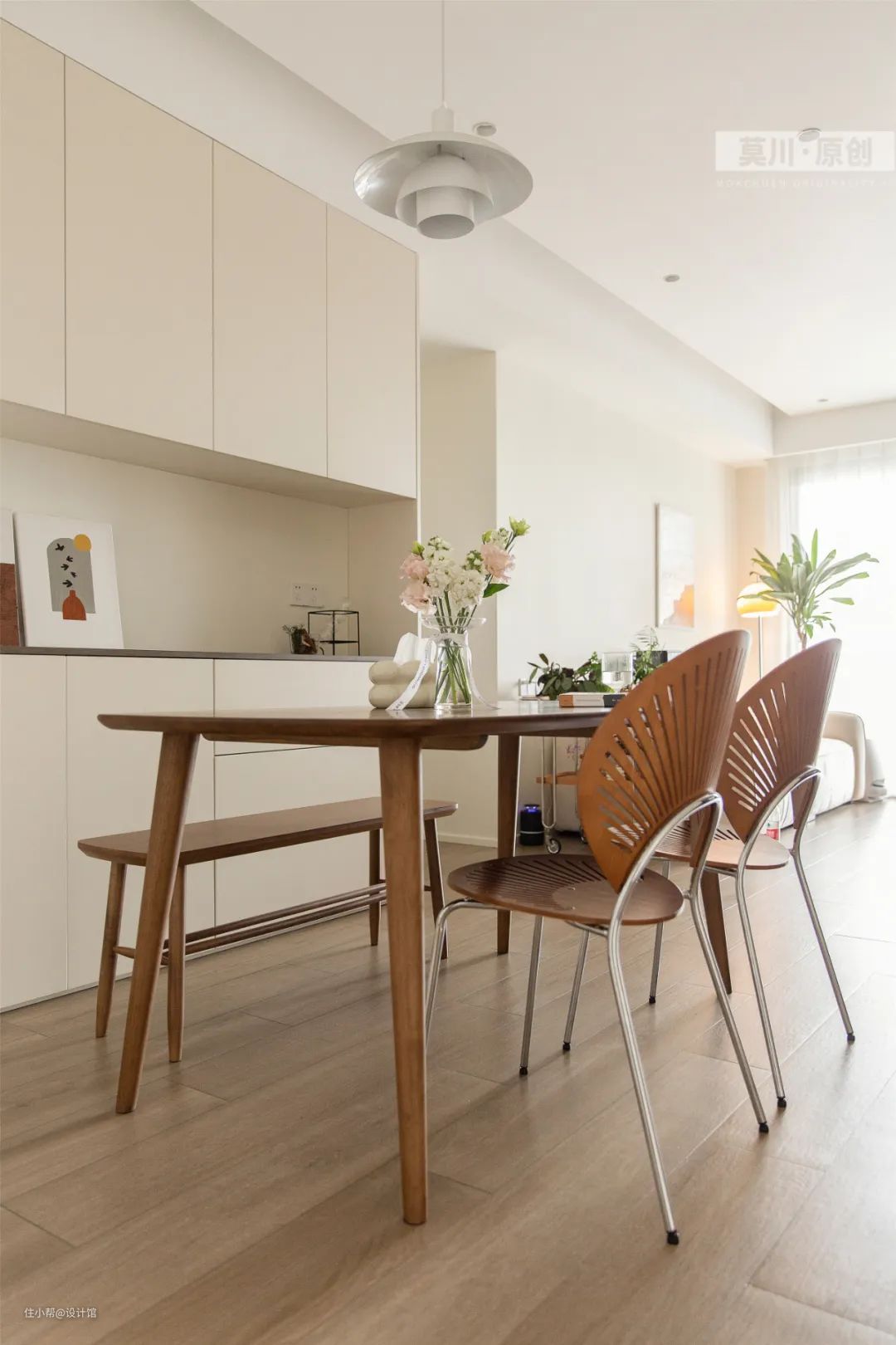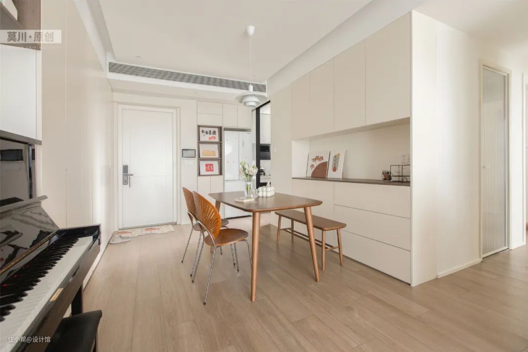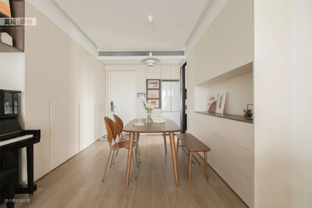 ▲餐厅以奶油色的空间为主,摆上一张实木餐桌+板凳,还有两张铁艺架的餐椅,让用餐空间显得更加情调雅致。
