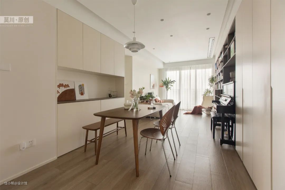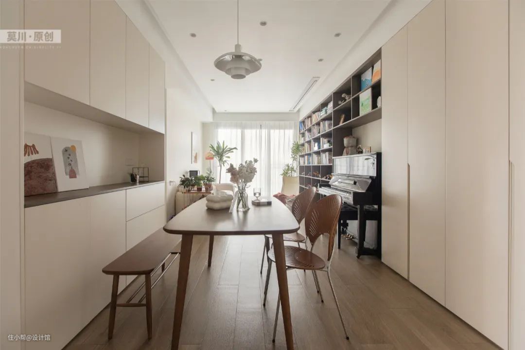▲沿着客厅定制书架装一整排的收纳柜,贯通整个餐厅区域,让空间简洁而又收纳强大。