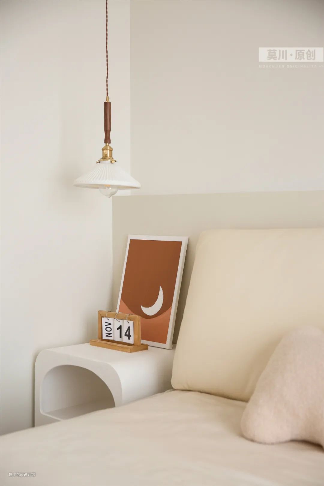 ▲另一侧摆一个造型优雅的床头柜,加入日历与棕褐色抽象画,让角落空间也有文艺优雅的气质。