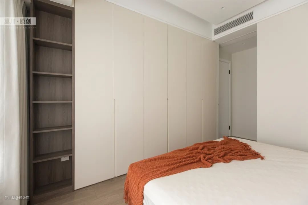 ▲次卧空间也是较为紧凑,实木床铺刚好卡入预设位置,布置净白床单与靠背,床尾衣柜以上下层的设计,让次卧空间也显得实用简洁而惬意。