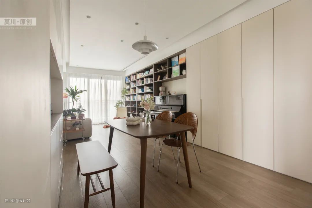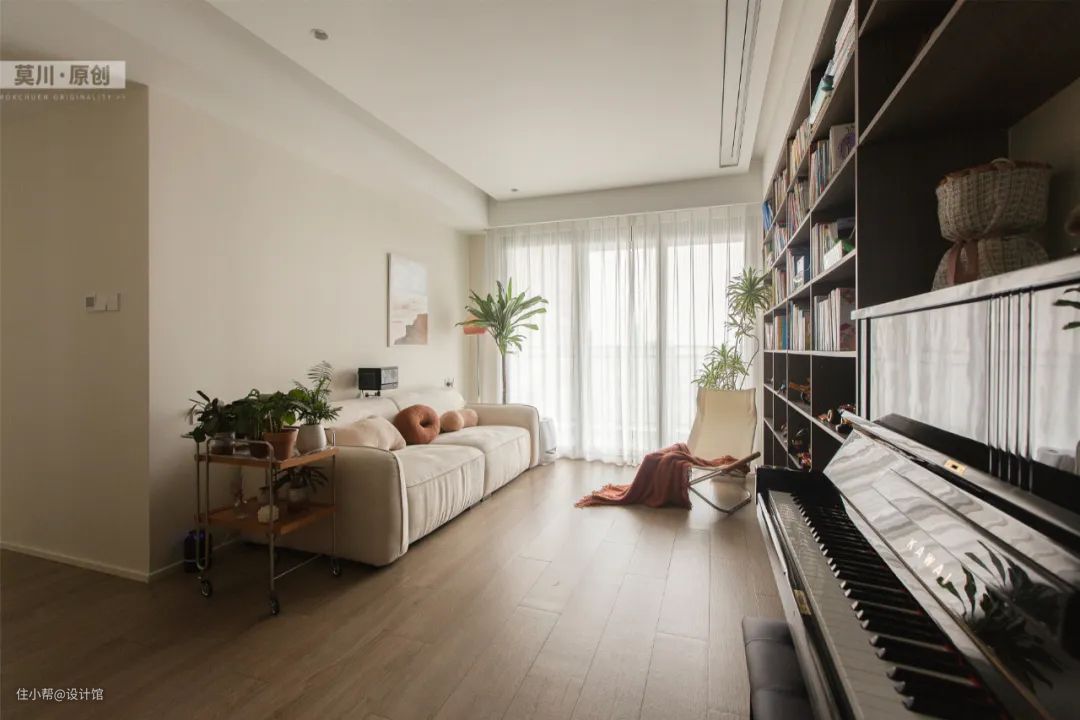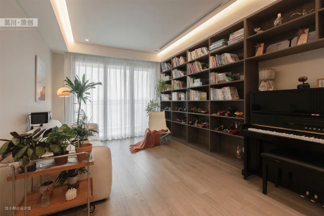 89㎡现代奶油风,电视墙做成书架,没电视的生活很文艺