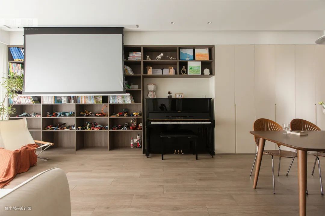 ▲书架上方的天花加入投影幕布,偶尔要看电影电视的时候,就可以用投影仪实现代替,享受大屏的乐趣。