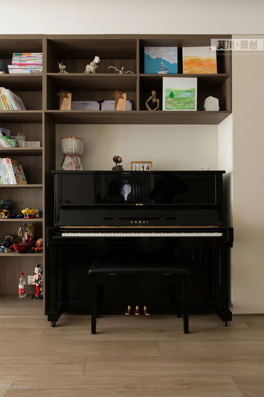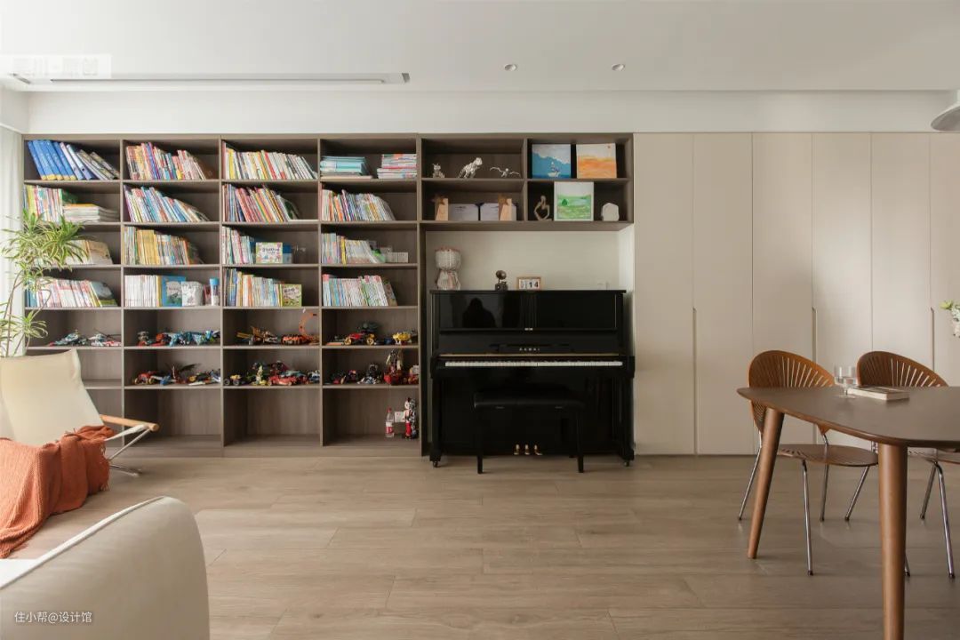 ▲为满足主人钢琴的爱好,在书架区腾空一个区域把钢琴嵌入进去,让空间利用更加得当。