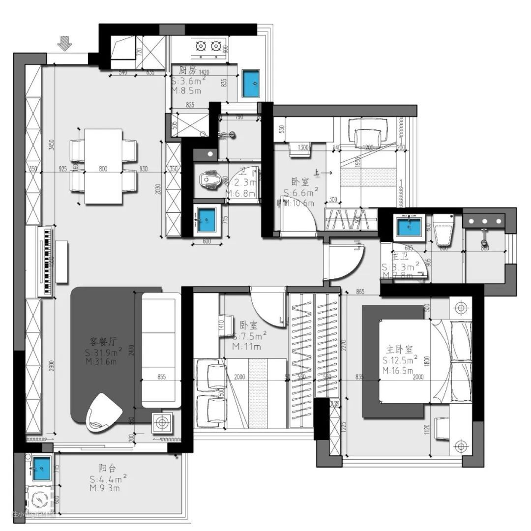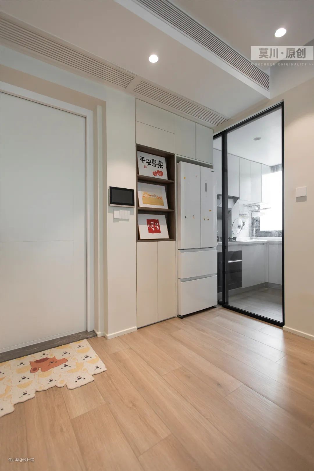 ▲玄关靠近厨房门口的位置装一个小收纳柜+嵌入冰箱,结合可爱的地毯,让玄关显得简约而又文艺。