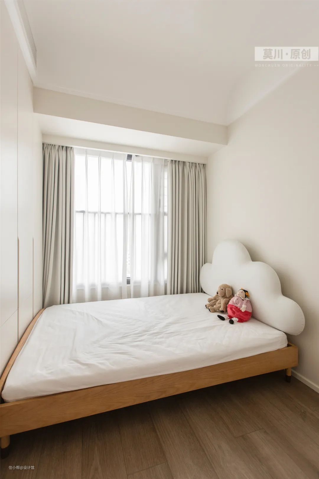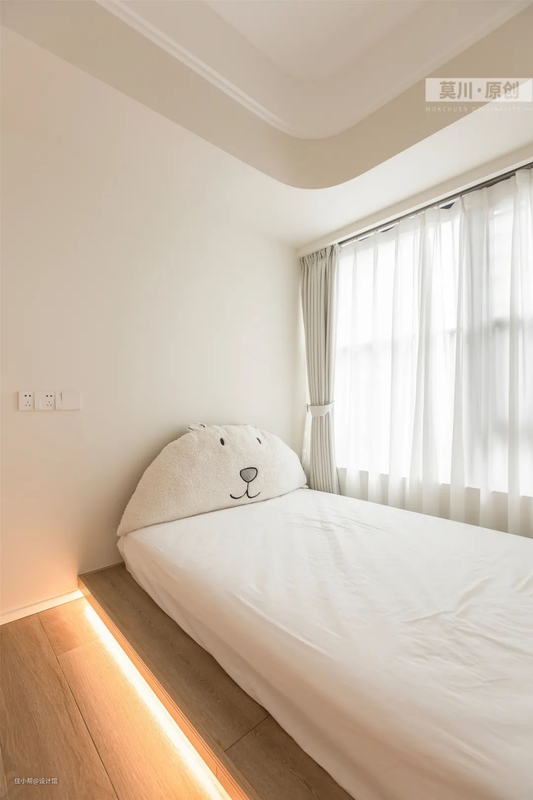 ▲儿童房以定制地台床设计,铺上白色床铺与窗帘,显得干净朴素而自然加入一个圆形卡通小靠背,天花也是做了圆角设计,让空间更加柔和舒适。