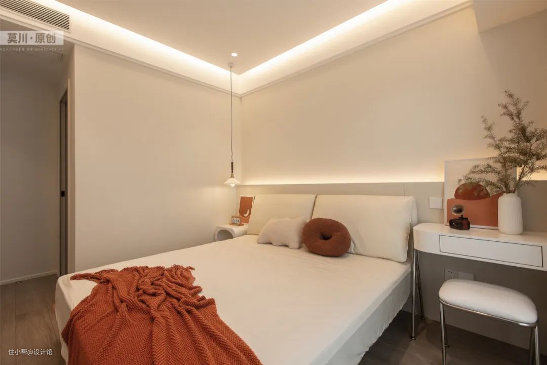 ▲无主灯的卧室,以床头与天花藏入灯带,做到见光不见灯的设计,照明环境和谐自然而惬意。