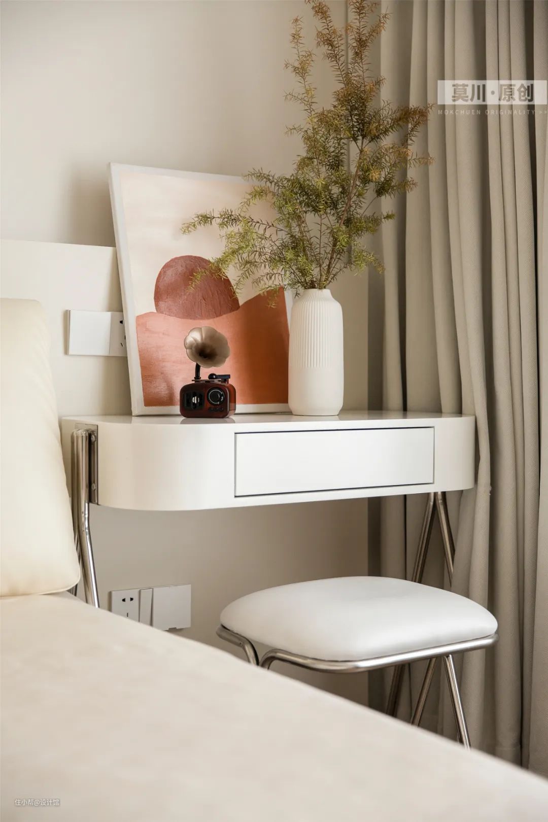▲一侧床头布置做梳妆台,加入装饰画、花瓶与复古摆件,显得实用而又雅致。