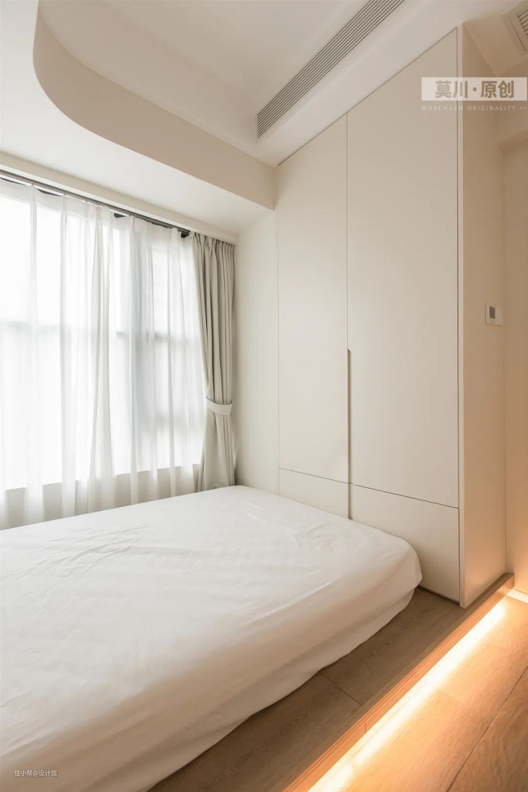 ▲地台加入灯带,床尾定制衣柜,天花藏入中央空调,整个空间面积紧凑却也实现了简洁实用的功能。