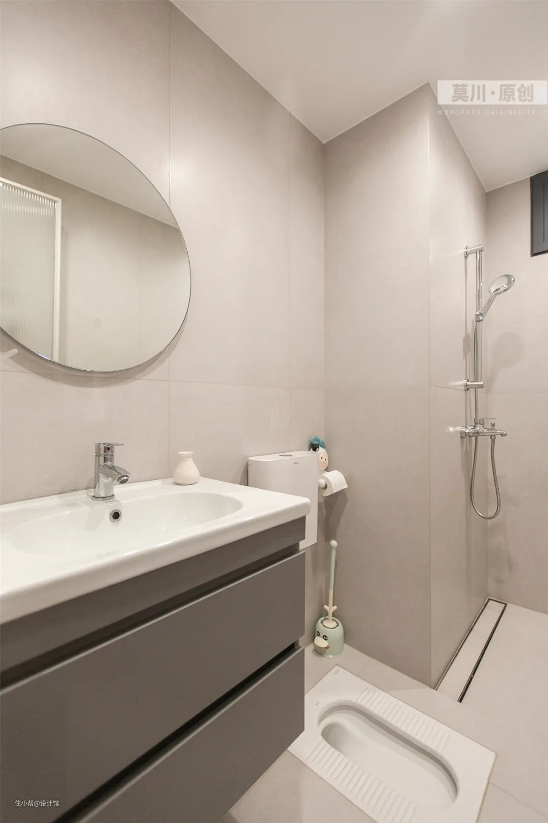 ▲浅灰色的墙面地面砖,搭配灰色洗手盆柜,并以蹲坑缓解面积小的囧境,让次卫空间简洁优雅而实用方便。