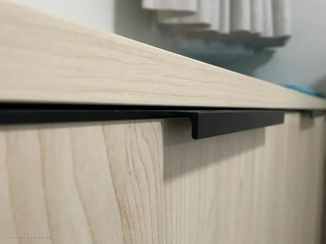 明装拉手不但影响整体的颜值,时间长了,拉手上面容易挂油污;隐形拉手不要做内嵌的把手,锐角锋利容易割手,也不要做反弹器,损坏率非常高。可以把吊柜门下探1cm,轻松开合,地柜门搭配L型的铝型材上探2cm,不仅好看清理也非常方便。
