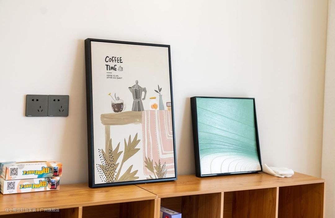 餐柜上摆放两幅装饰画和生活必需品,便捷又好看,幸福感直线UPUP!