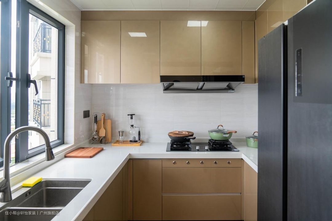 厨房橱柜和吊柜的颜色都采用杏色调亮面,上下呼应,和嵌入式电器配合,搭配协调,增加了厨房收纳的实用性。