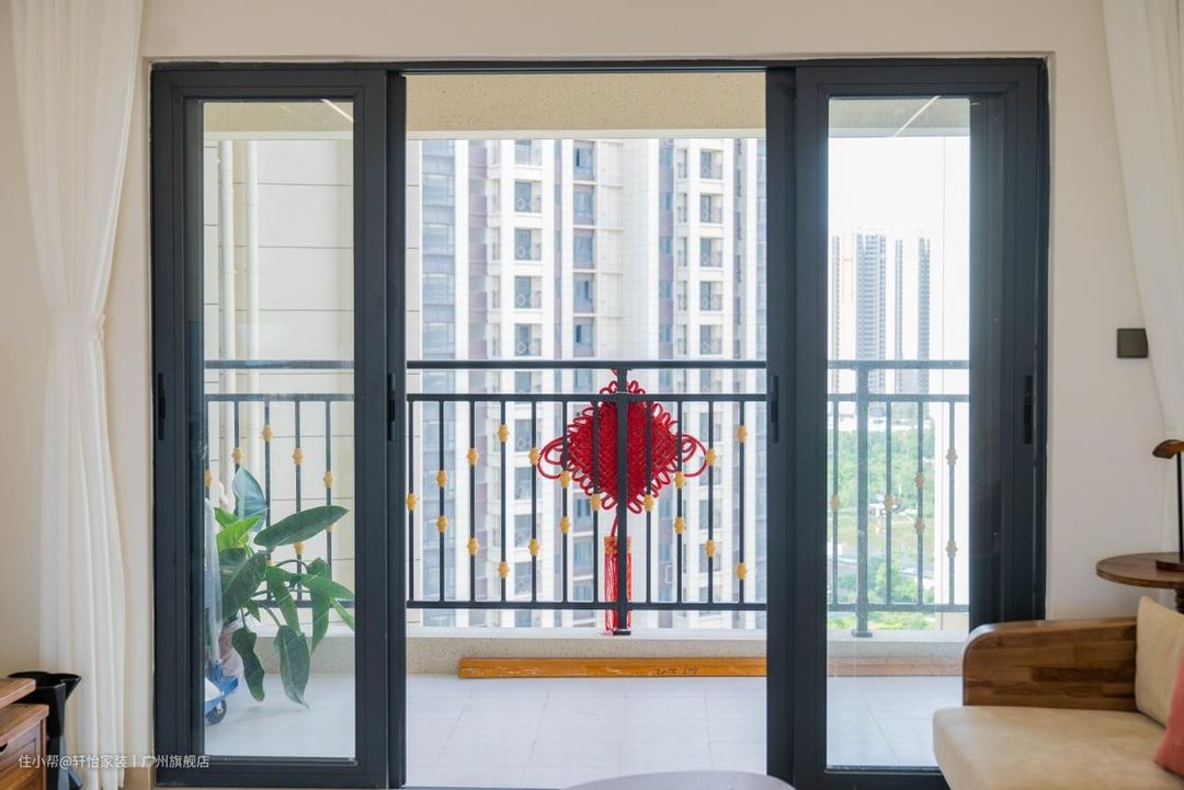 阳台和客厅之间做了铝合玻璃推拉门隔断,阳台上摆放着绿植装饰,大飘窗采光性很好,阳关透过玻璃照射进来,使得更加的明亮温馨!