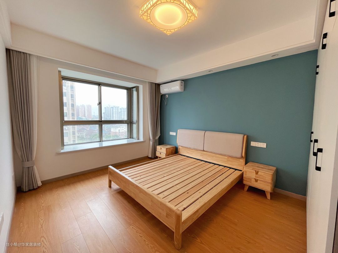 - 卧室采用暖色系实木床作为主体,配上浅灰色的高级软包床头,整体氛围简洁清新,唤醒生活的多巴胺,生活氛围超愉快;