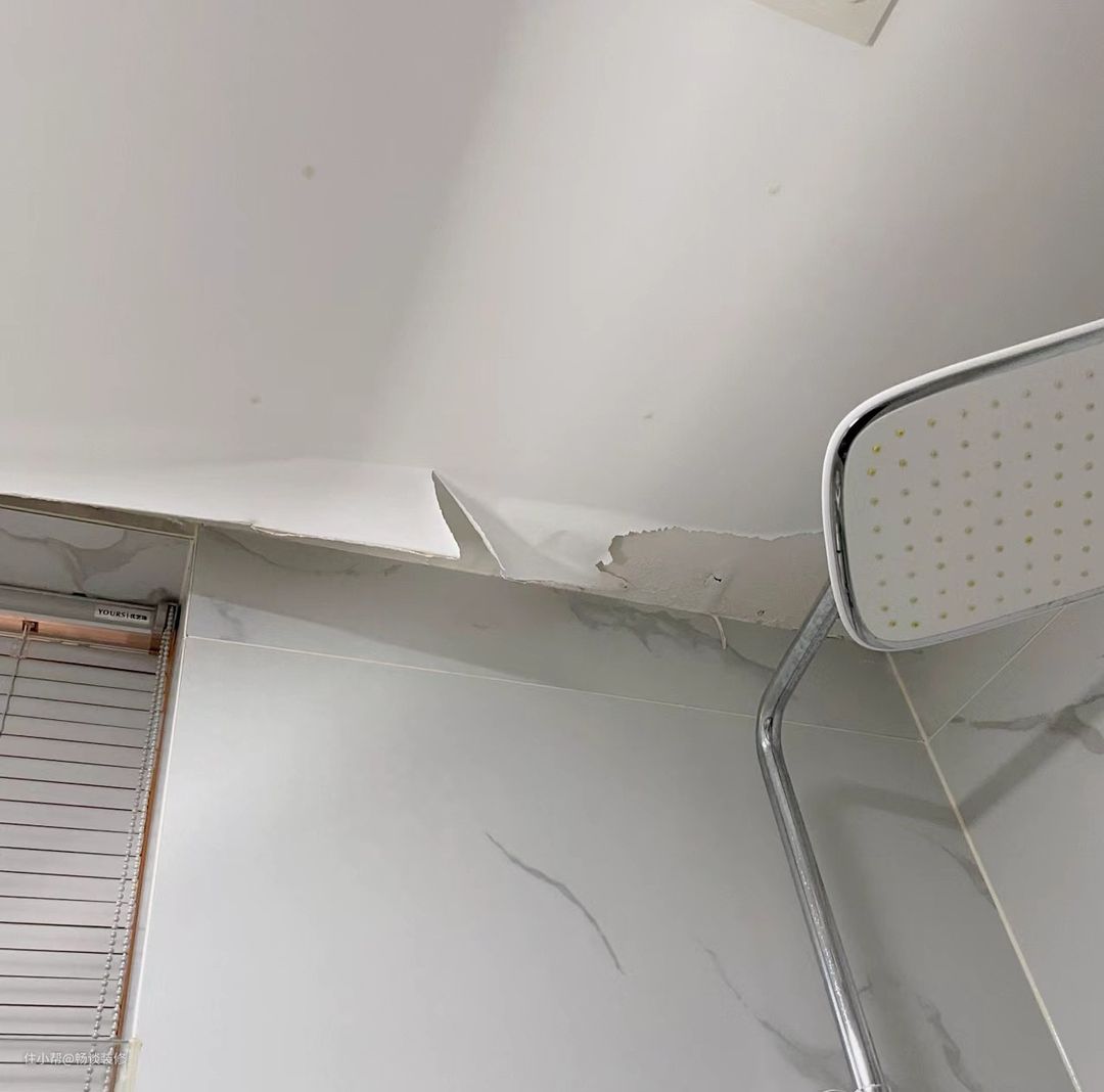 石膏板吊顶设计在卫生间里,就算是用防水材料来做的,一年半载后,水汽粘在石膏板吊顶上,就会导致腻子,乳胶漆发霉,变黄,脱落。