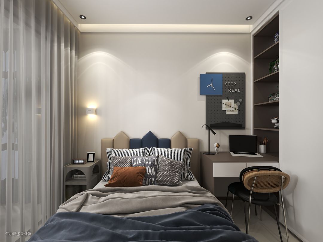 卧室的通顶定制收纳柜颜值满分,面板采用肤感面材质,有效提升空间质感,搭配上学习书桌,自由度大大提高,还能锻炼孩子收纳分工与自主能力