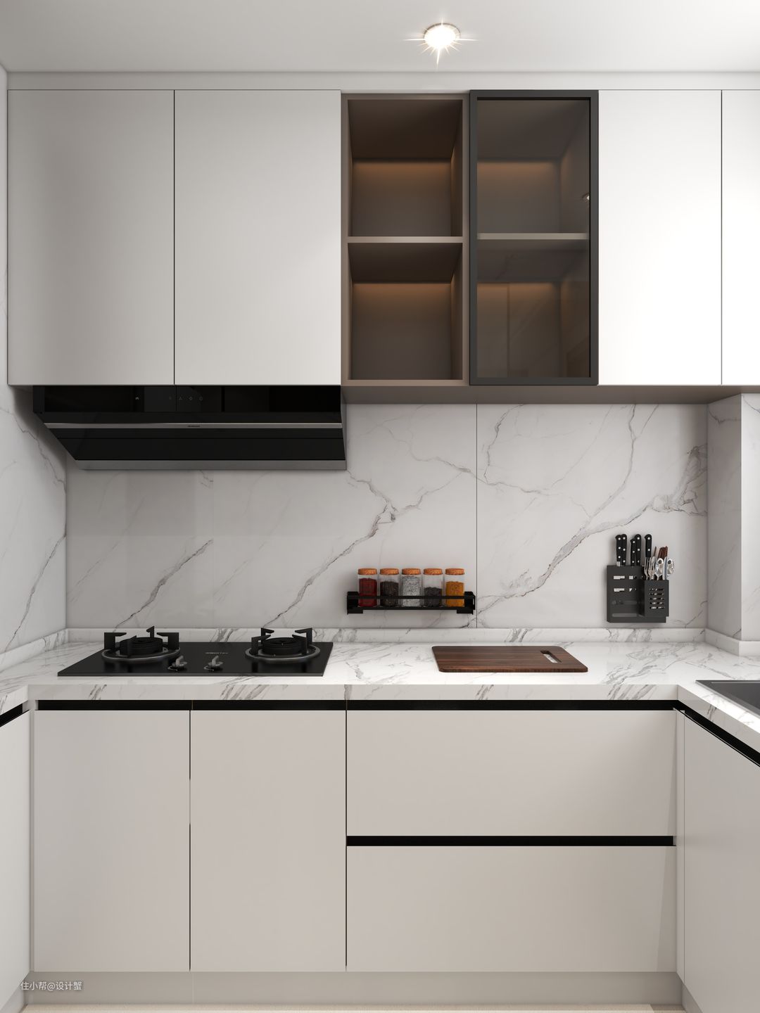 动线超合理的“U”橱柜设计,台下嵌入式电器。白色大理石材橱柜台面布局宽裕,备菜区紧邻烹饪区,也可以让烹饪更加有序。洗涤区面向窗户,边清洗手中的蔬菜瓜果也可以看看远处,使身心放松。